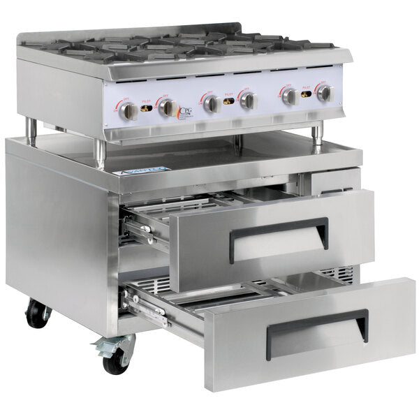 Keep up with customer demands with this Cooking Performance Group 36RRBNL 6 burner gas countertop range with 2 drawer refrigerated chef base.
