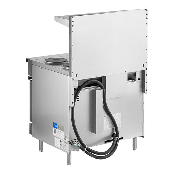 This model includes a 19 3/8" high backsplash to protect your wall from damage, and the metal control knobs are extremely easy to wipe down. It also includes a back shelf to keep essential seasonings and supplies readily accessible. This unit requires a 240V, 1 phase electrical connection for operation. It can also be converted to 3 phase.