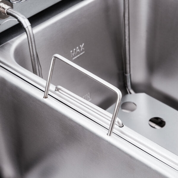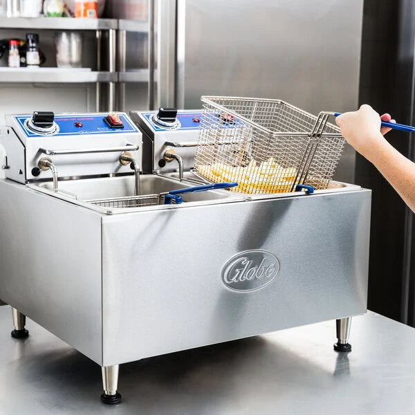 Cook your most popular entrees and sides with the Globe PF32E 32 lb. dual tank electric countertop fryer! This fryer features up to 7600 watts of heating power in each tank to ensure your food is thoroughly cooked just the way your customers like it, and its two 16 lb. oil tanks give you a large capacity to work with. The easy-to-use controls include a high temperature thermal limit with manual reset for operator safety, while the elements swing up for easy access to the tanks. The control box is removable for fast cleaning, and the all stainless steel construction is designed for long-lasting durability. And thanks to its 3 1/2" stainless steel adjustable feet, you can be sure this fryer will remain steady at the optimum cooking height during use.