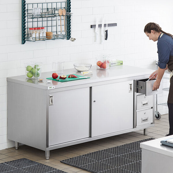 Regency 30" x 72" 16 Gauge Type 304 Stainless Steel Enclosed Base Sliding Door Table with Drawers