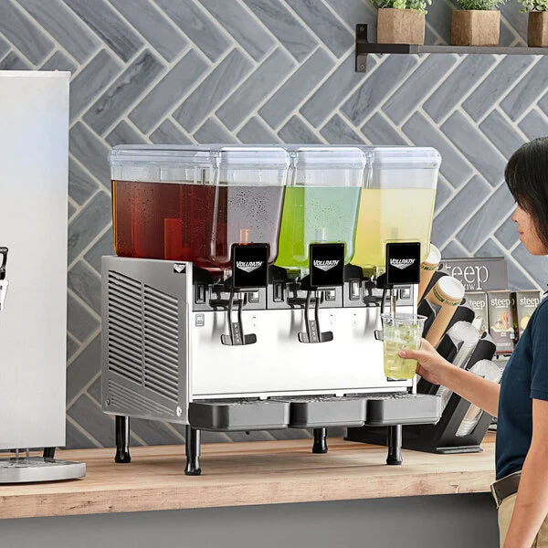 Offer a refreshing, cold beverage with the Vollrath VBBD3-37-S triple 3.17 gallon bowl refrigerated beverage dispenser with stirring paddle circulation. This dispenser features (3) 3.17 gallon bowls made of clear polycarbonate to not only last in commercial settings, but to showcase the brilliant colors of fruit juices or the rich tones of tea or coffee. Because they each circulate product with a stirring paddle, the dispenser is ideal for these and other foaming beverages. Whether used in a cafe, at a breakfast buffet, or in a convenience store, this beverage dispenser makes it easy to merchandise and serve customers' favorite drinks.